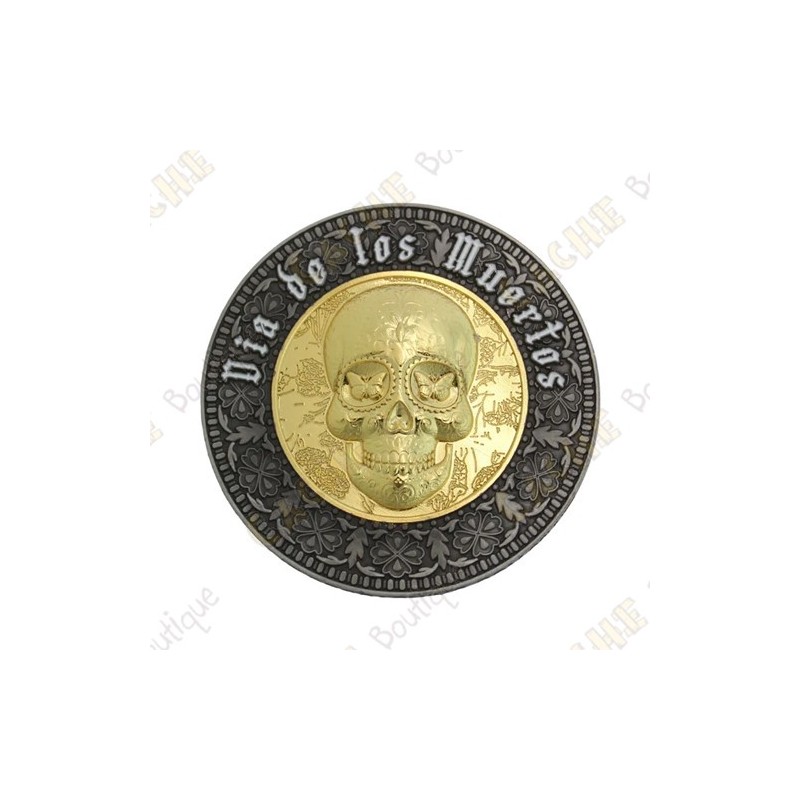 Un géocoin pour célébrer la fête des morts, "el dia de los muertos", avec une belle partie dorée brillante en 3D.